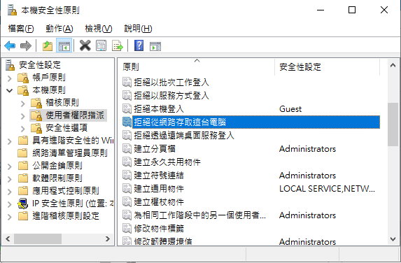 1. 所有控制台項目 \ 系統管理工具 \ 本機安全性原則<註1> \ 安全性 \ 本機原則 \ 使用者權限指派 \ 拒絕從網路存取這台電腦 :