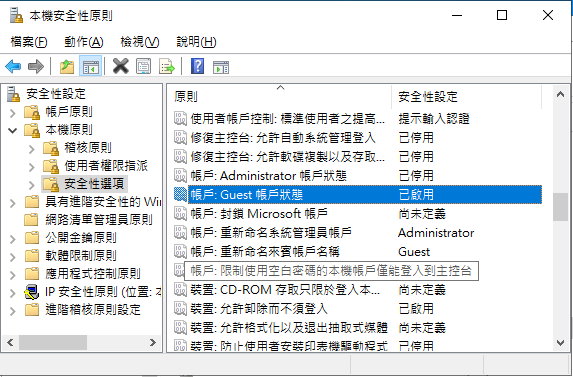 2. 所有控制台項目 \ 系統管理工具 \ 本機安全性原則<註1> \ 安全性 \ 本機原則 \ 安全性選項 \ 帳號:Guest 帳戶狀態 :
