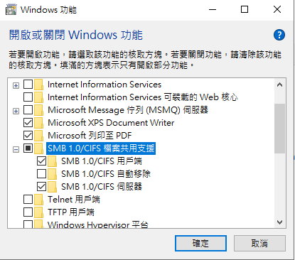 3. 所有控制台項目 \ 程式和功能 \ 開啟或關閉 Windows 功能 \ SMB 1.0/CIFS 檔案共用資源<註2>: