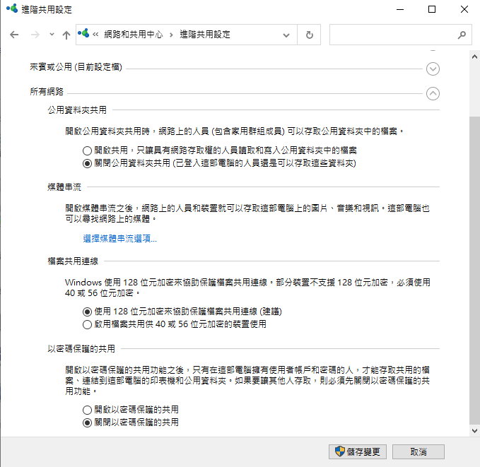 7. 所有控制台項目 \ 網路和網際網路 \ 網路和共用中心 \ 進階共用設定 \ 所有網路 \ 以密碼保護的共用: